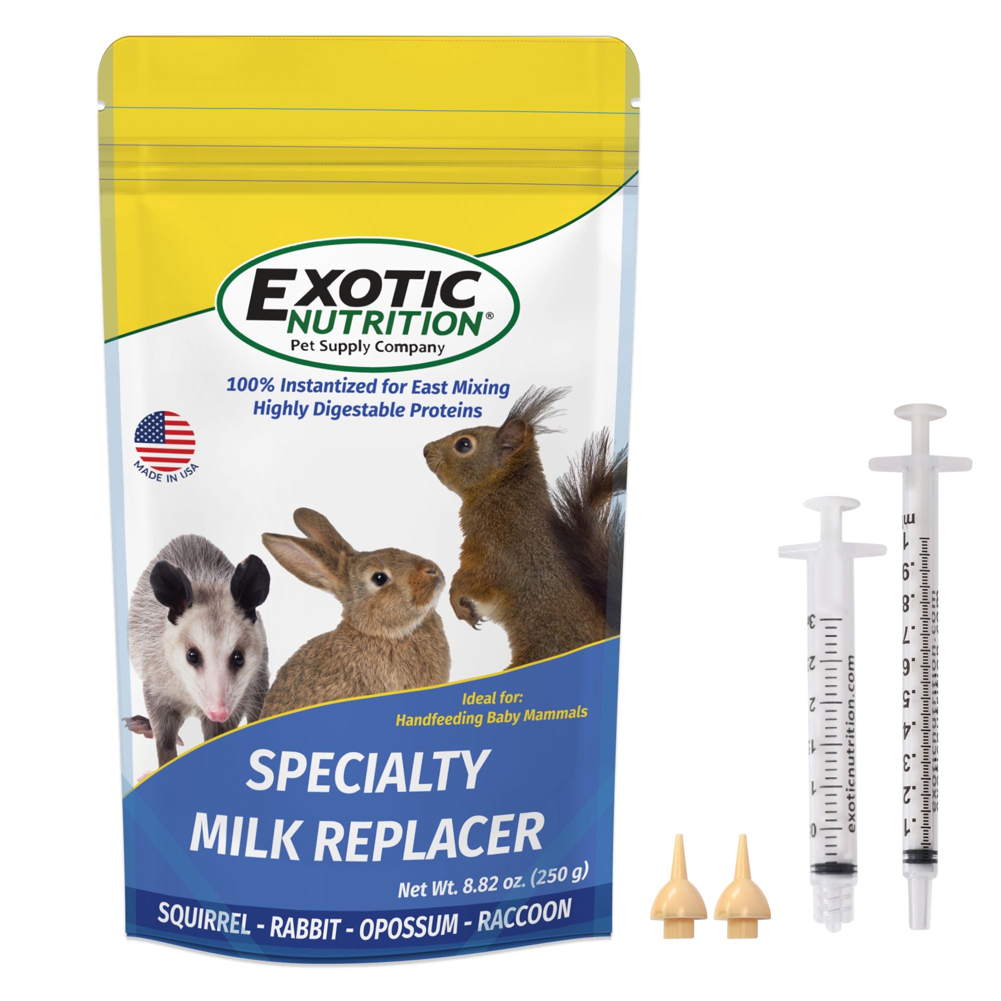 Hand raising a baby squirrel? The Baby Squirrel Nursing Set includes essentials such as milk replacer, syringes and nipples. is a powdered formula that mixed with water to form a complete food source for orphaned or rejected baby animals, as well as pregnant females. Formulated to closely match mother's milk in protein, fat, and carbohydrates. Provides foundation of nutrients for strong development. Enriched with high-quality protein sources, vitamins, minerals, and essential amino acids. Easily digestible and highly palatable. Produces better weight gain, fewer digestive problems, and better acceptance than other formulas.