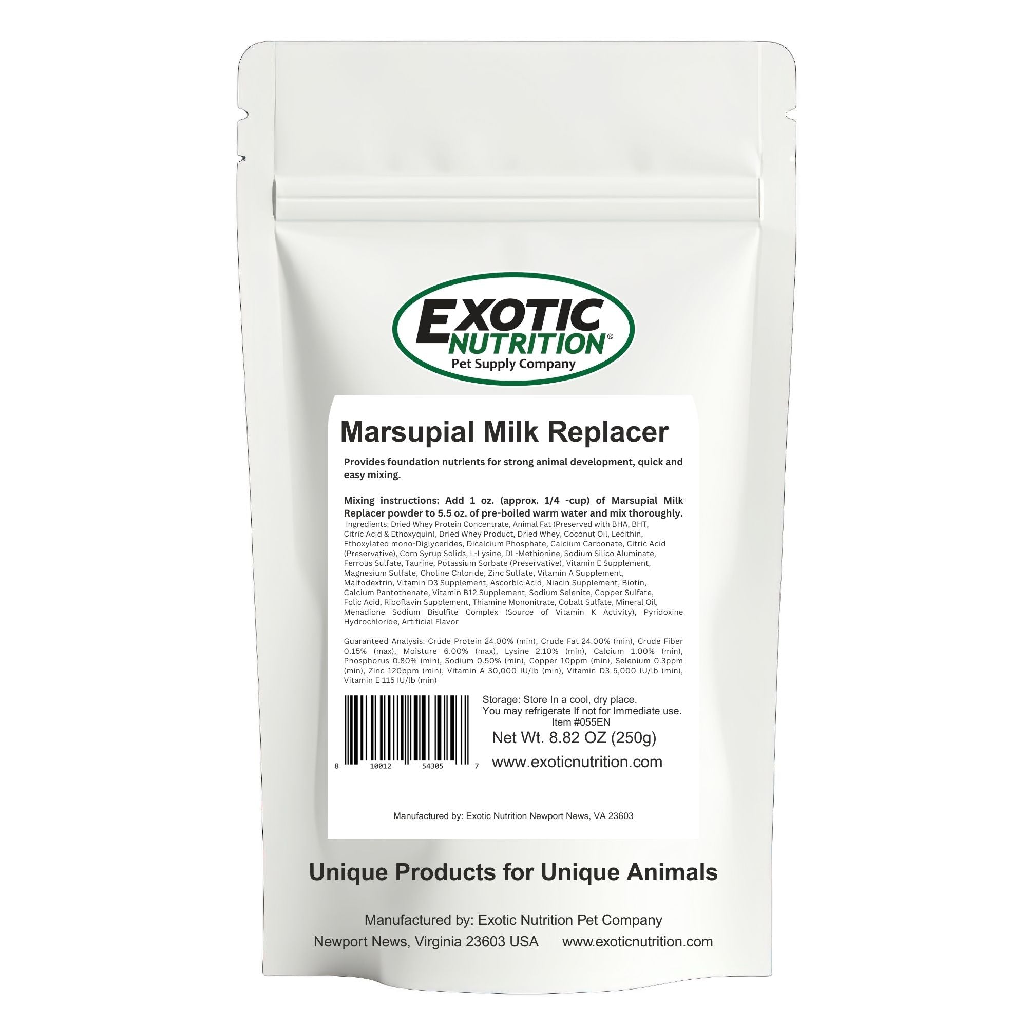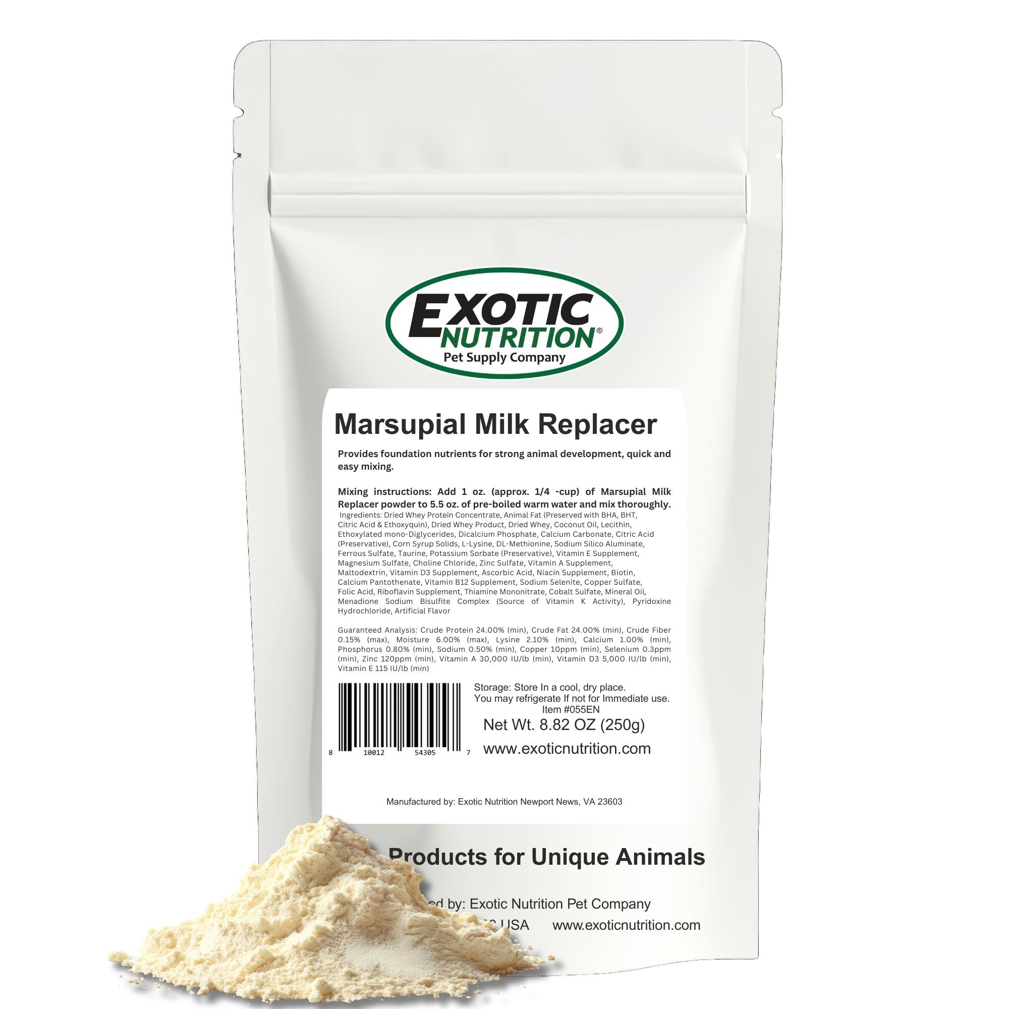 Quick & easy powdered milk replacement formula is a complete food source for orphaned or rejected baby animals, as well as pregnant females. Formulated to closely match mother's milk in protein, fat, and carbohydrates. Provides foundation of nutrients for strong development. Enriched with high-quality protein sources, vitamins, minerals, and essential amino acids. Easily digestible and highly palatable. Produces better weight gain, fewer digestive problems, and better acceptance than other formulas. Ideal for sugar gliders, possums or other marsupials. All natural, no preservatives, made in the USA. Size: Contains 250 grams or 8.8 ounces