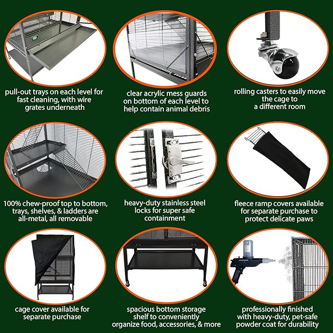 Exotic Nutrition's 2-Level Mansion cage for small animals boasts a sturdy metal frame and 100% metal (no plastic) construction, with 6 inch high plexiglass guards on all four sides. It has a sleek black hammer tone finish that complements any decor and provides ample space for your pet to play, climb, and explore. The elevated platforms and ramp ladders offer a comfortable and safe lookout for your pet. The stand adds convenience and storage options, while the half-inch wire spacing ensures your pet's security. Measuring 32 inches wide x 22 inches deep x 38.5 inches tall (22.5 inches tall without the stand), this high-quality habitat is perfect for small animals such as rats, ferrets, chinchillas, guinea pigs, degus, and more. The chew-proof tray helps keep debris off the floor and the door has "critter-proof" latches for easy access.