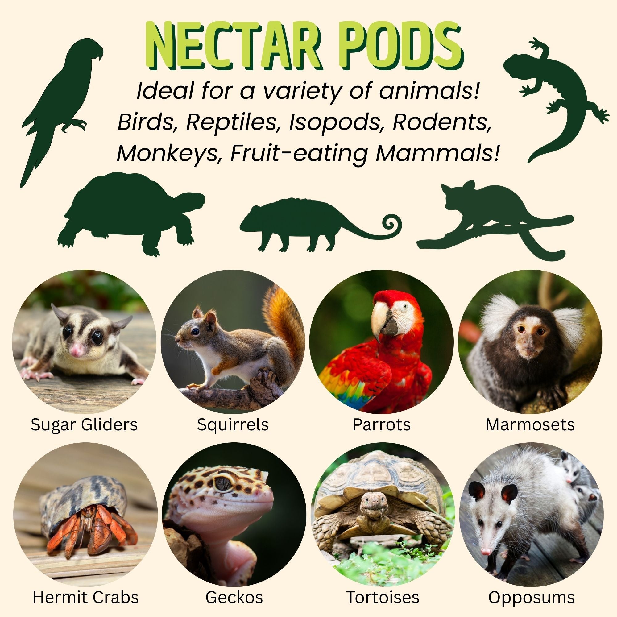 Exotic Nutrition's Nectar Pods are a fruit-based jelly treat available in five different flavors. Offering your pet a delicious treat has never been easier! Perfect for bonding and to help keep your pet hydrated! The exotic fruit flavors & added calcium make Nectar Pods the ideal treat for birds, fruit-eating mammals, and day geckos.