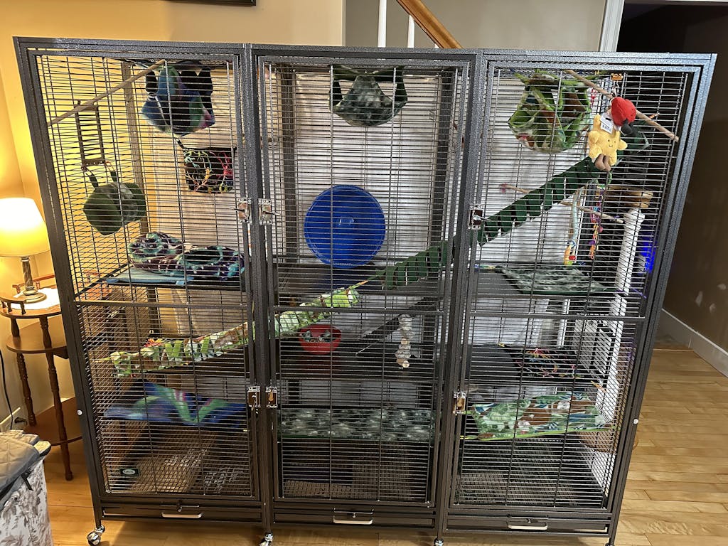 The Borneo Cage (Version II) from Exotic Nutrition is crafted with the highest quality materials and outstanding workmanship, featuring 38 ft cubic space, removable wired floor grates over the catch trays, four locking side access doors, and full-length front doors with stainless steel locks. Pull-out catch trays make cleaning a breeze. This cage is perfect for sugar gliders, chinchillas, squirrels, rats, marmosets, birds (Parakeets, Conures, Lovebirds, Cockatiels, Finches), Old-World Chameleons and other small pets. Best of all ... this cage is expandable! You can purchase additional add-on sections to increase the size.
