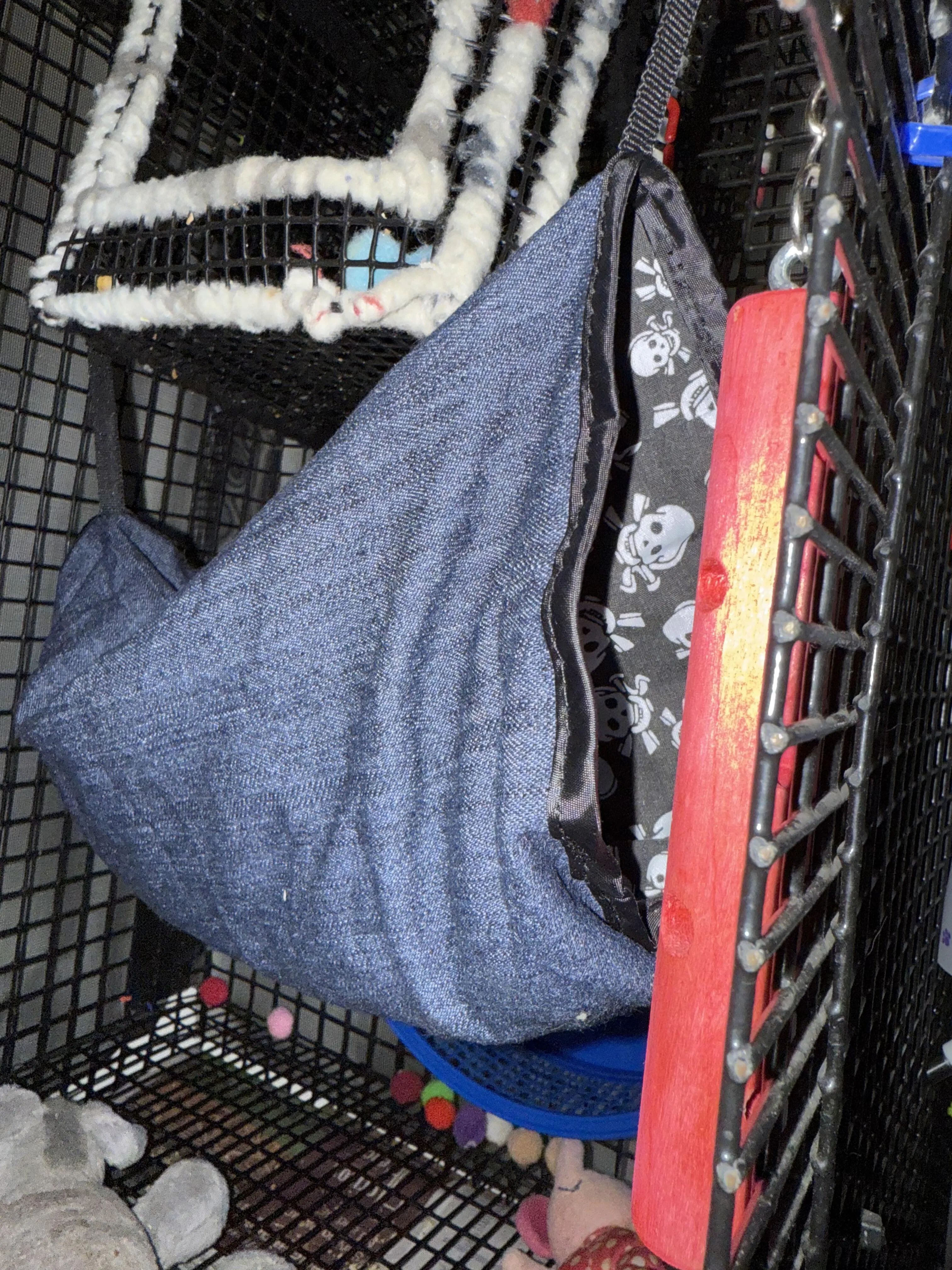 Exotic Nutrition's Bad Azz Tunnel is reversible - with soft denim material on one side and wipeable skull-design interior. The tunnel makes a fun, crinkle sound and fits inside any wire cage. Hangs from side or top of any cage with four durable nylon straps and clips that allow for easy cage attachment (hardware included). Designed for sugar gliders, squirrels, prairie dogs, degus, rats, marmosets, and other small mammals. Measurements: approximately 14" L x 10" H (hanging) x 6" diameter openings.