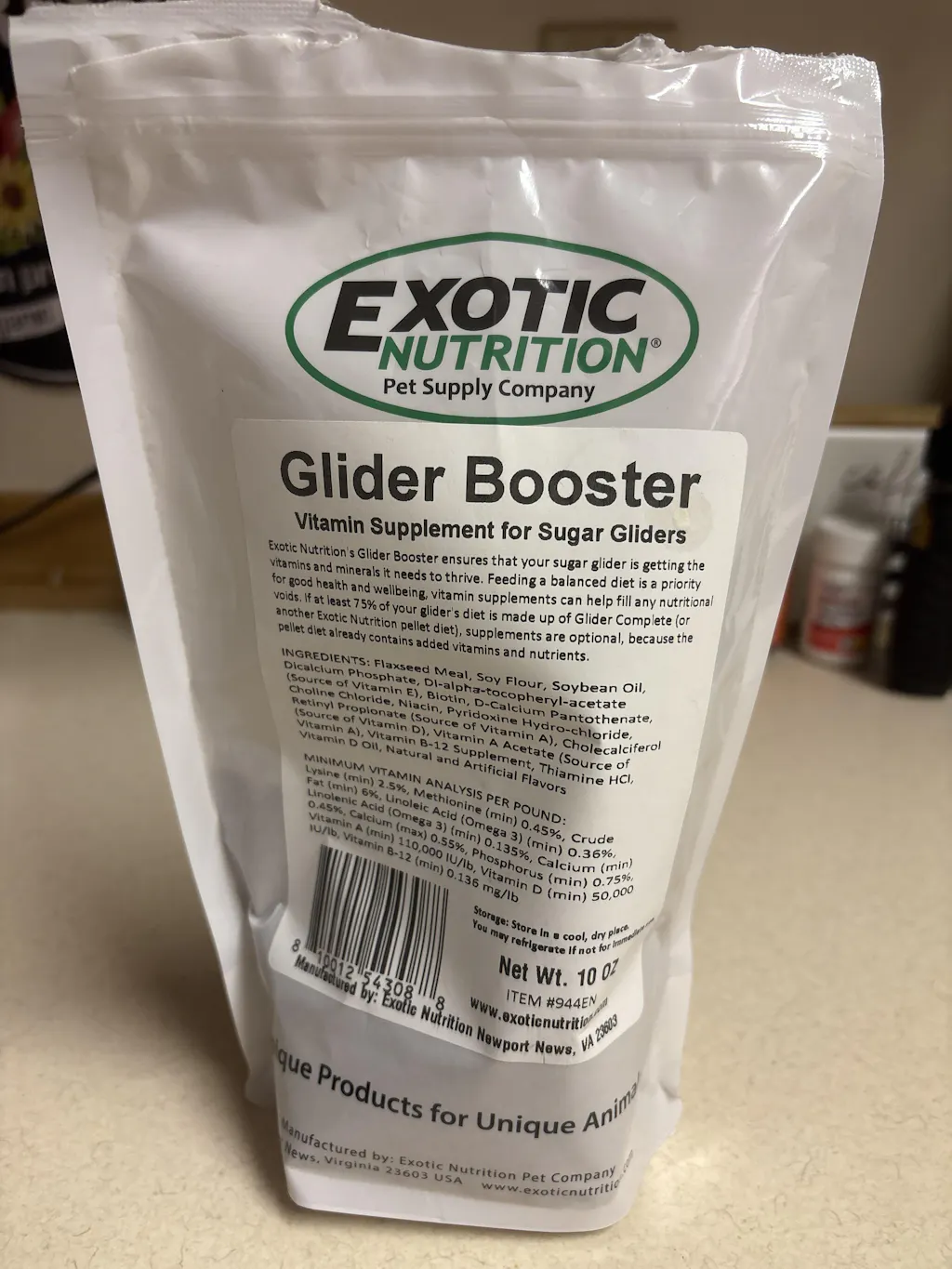 Exotic Nutrition's Glider Booster ensures that your sugar glider is getting the vitamins and minerals it needs to thrive. Feeding a balanced diet is a priority for good health and wellbeing, vitamin supplements can help fill any nutritional voids. If at least 75% of your glider's diet is made up of (or another Exotic Nutrition pellet diet), supplements are optional, because the pellet diet already contains added vitamins and nutrients. to view a breakdown of the vitamins and minerals in this booster.