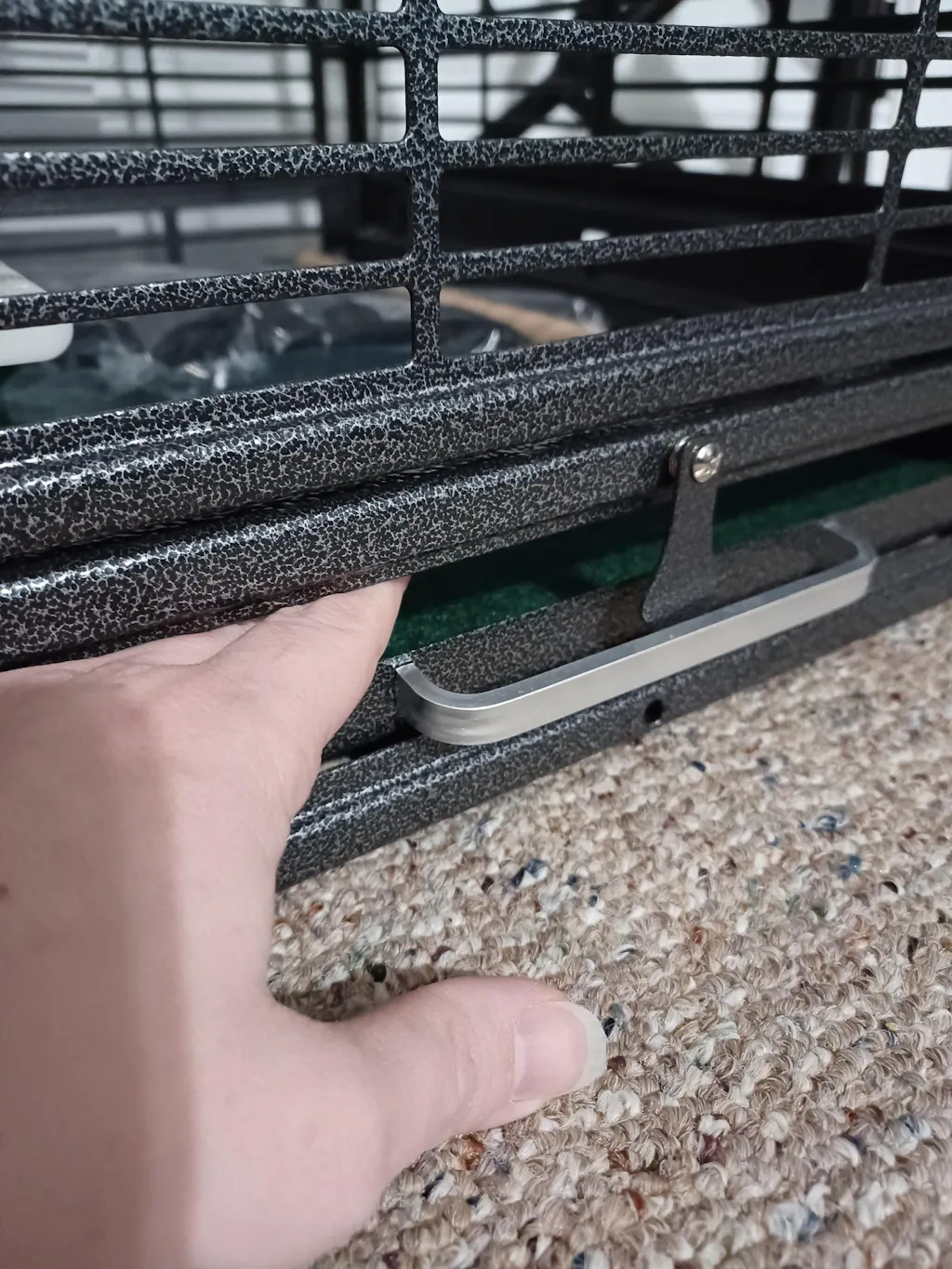 Designed with a powder coat for long lasting use, this cage is far sturdier than most travel cages or carriers on the market. The large design provides plenty of interior space for your pet to feel content while remaining secure inside. It is built with a seatbelt attachment for safe car travel. Also included are plastic feed/water dishes, a wooden climbing post inside the cage, plus an exterior perch on top. There is a removeable wired grate held in place with a locking mechanism and a solid catch tray that allows for easy cleaning during travel.